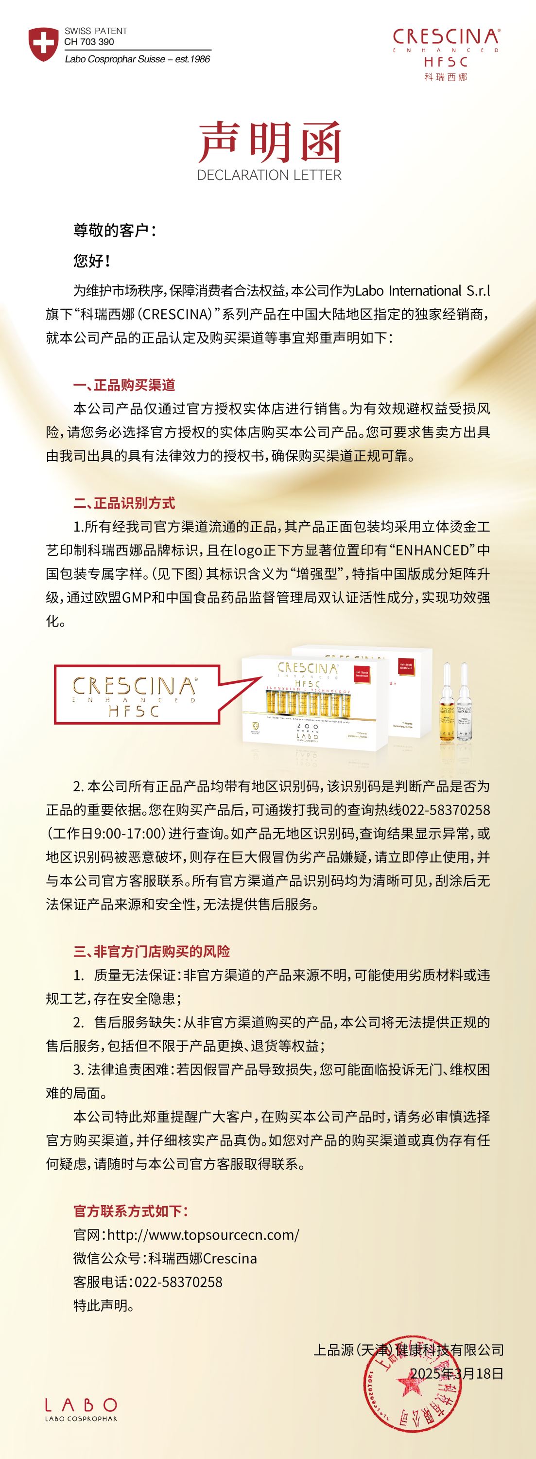 科瑞西娜CRESCINA關(guān)于正品認(rèn)定及購(gòu)買(mǎi)渠道等事宜相關(guān)聲明